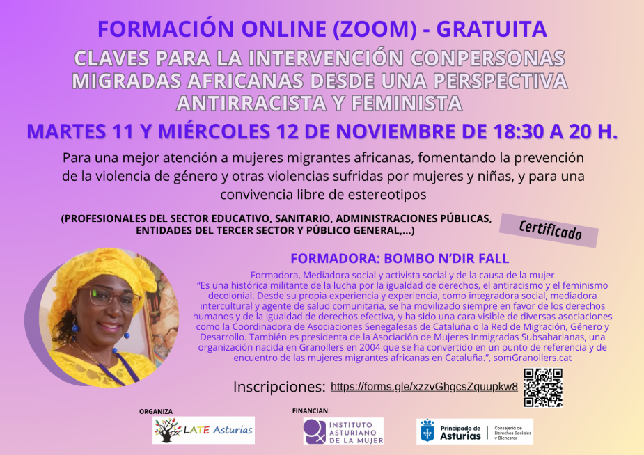 Esta formación está inscrita en el proyecto: “Nosotras nos cuidamos”: prevenir y contribuir a acabar con todas las violencias contra las mujeres vividas por las mujeres africanas residentes en Asturias y sus descendientes, mediante el empoderamiento individual y colectivo para mejorar la calidad de vida a través de la salud y la participación social.
