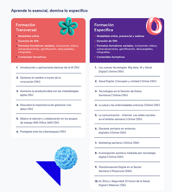 El objetivo principal del programa es proporcionar a más de 80.000 profesionales sanitarios y no sanitarios una formación avanzada y de calidad en competencias digitales e inteligencia artificial. Con ello, se pretende garantizar una prestación de servicios más eficiente y adaptada a las necesidades de la sociedad.